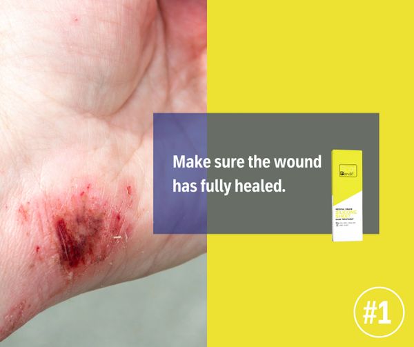 Avoid prolonged sun exposure and use sunscreen with SPF 30 or higher on scarred areas to prevent hyperpigmentation and minimize damage.